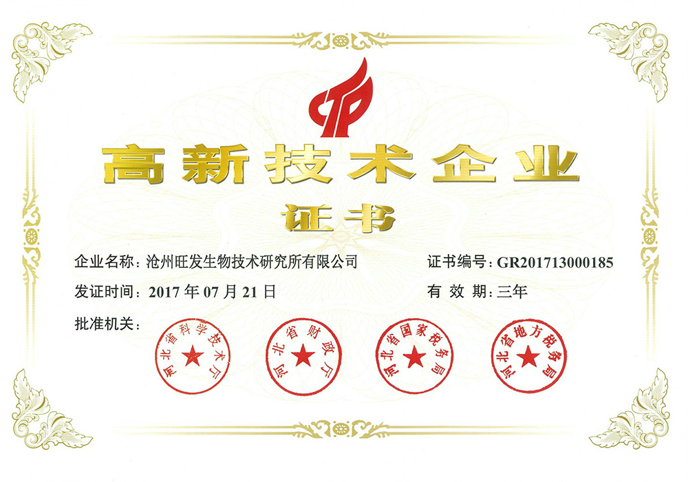 滄州旺發生物技術研究所有限公司創立于1993年,是集研發、生產、銷售于一體的微生態制劑生產“高新技術企業”、“國家知識產權優勢企業”、“河北省農業產業化重點龍頭企業”、“河北省創新型中小企業”、“河北省專精特新中小企業”,目前,公司注冊資金1360萬元,生產占地80畝,擁有液、固態結合全自動發酵生產線及標準化全自動液態發酵、噴霧干燥生產線。